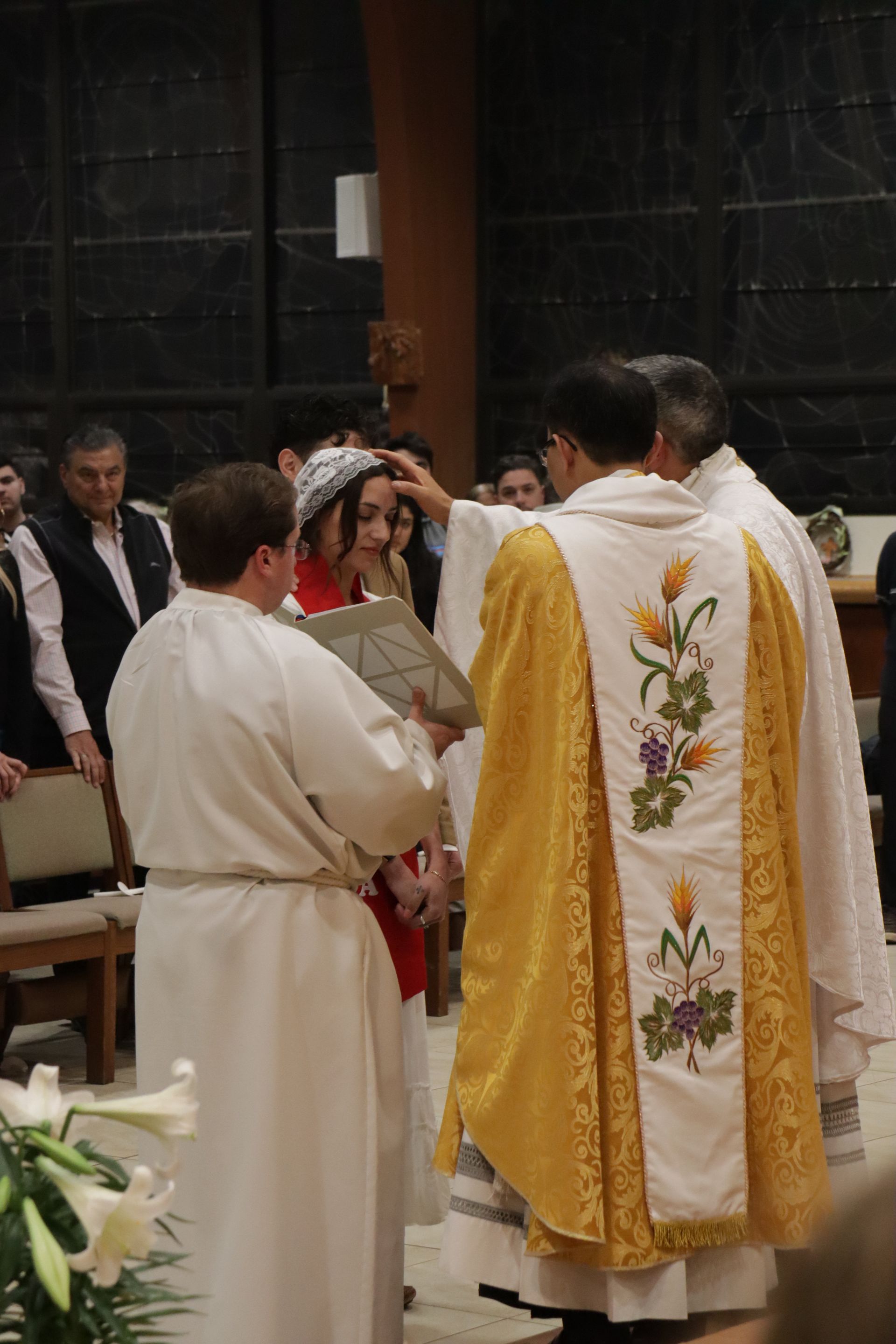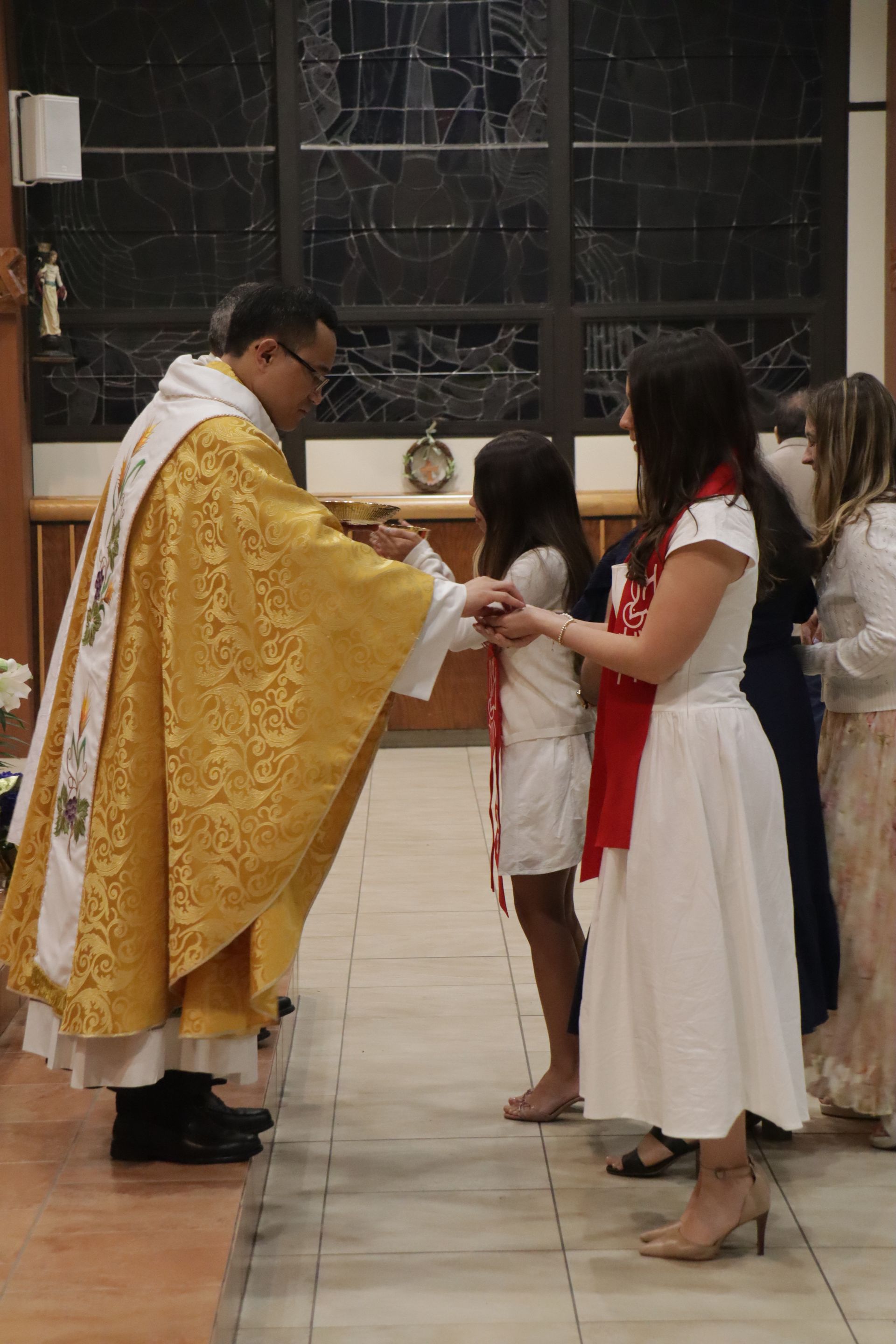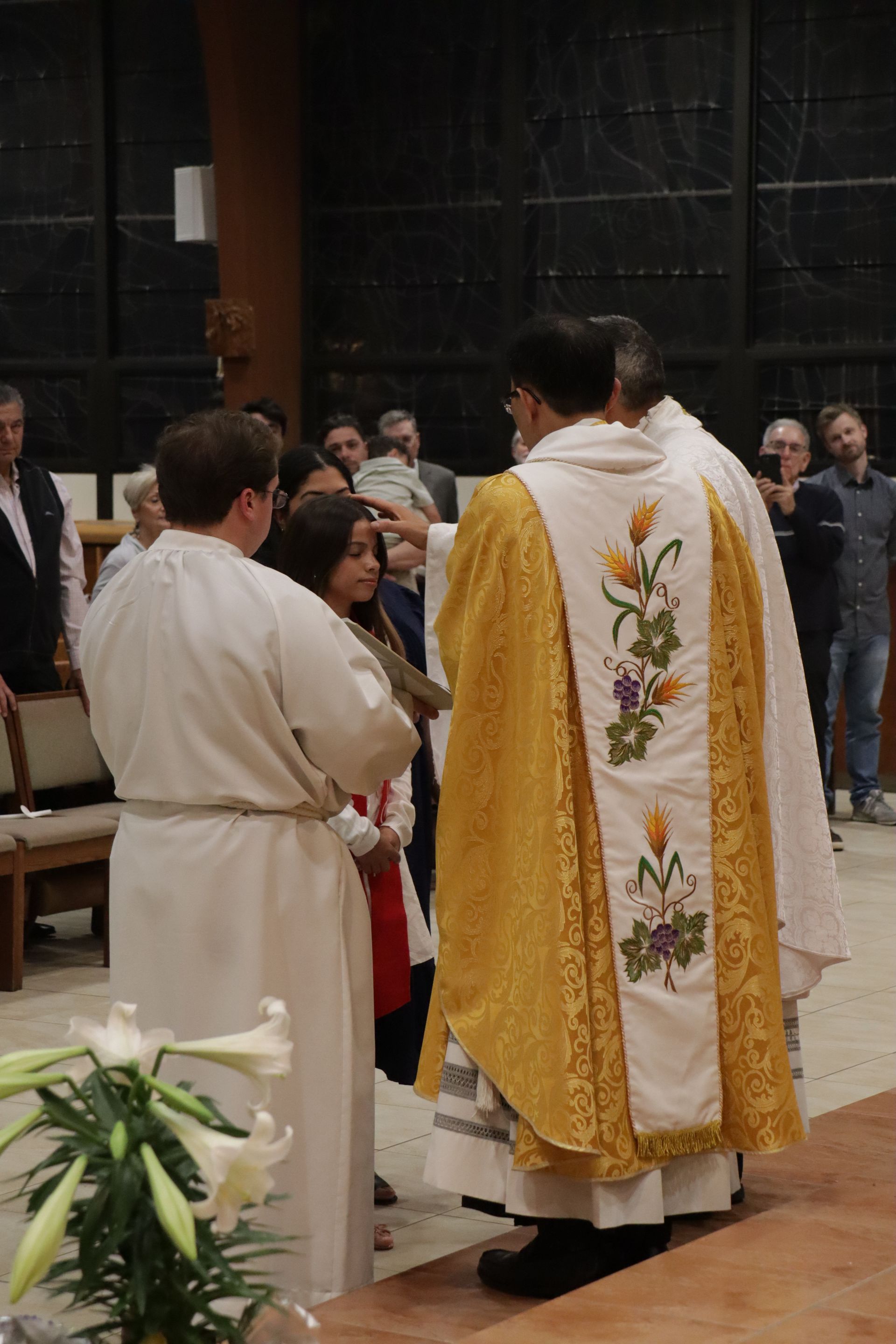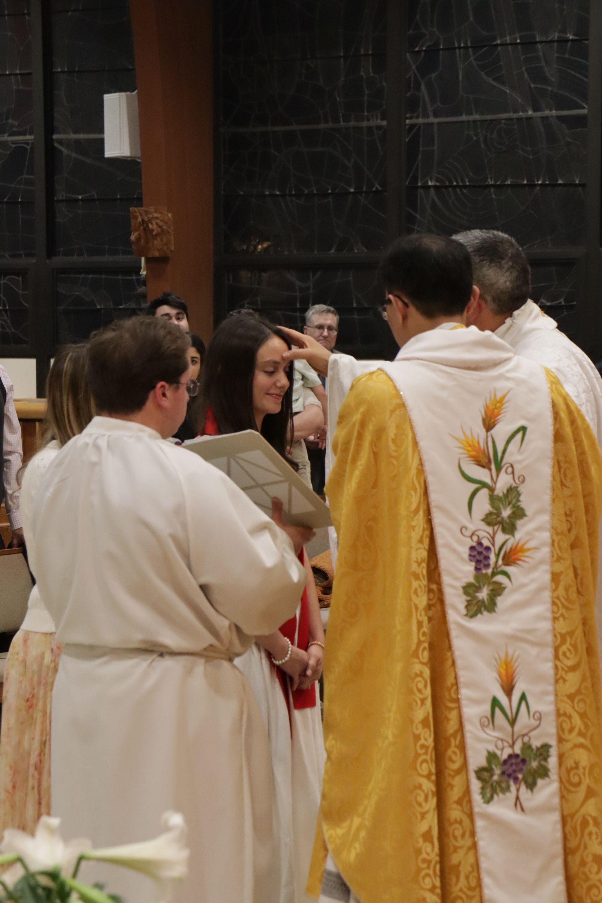 After the baptism the newly baptized are dressed in white garments and are presented with a candle lighted from the Paschal Candle. The newly baptized are then confirmed by the priest or bishop whose imposes hands on their heads, and invokes the gift of the Holy Spirit. He then anoints them with the oil called Sacred Chrism.