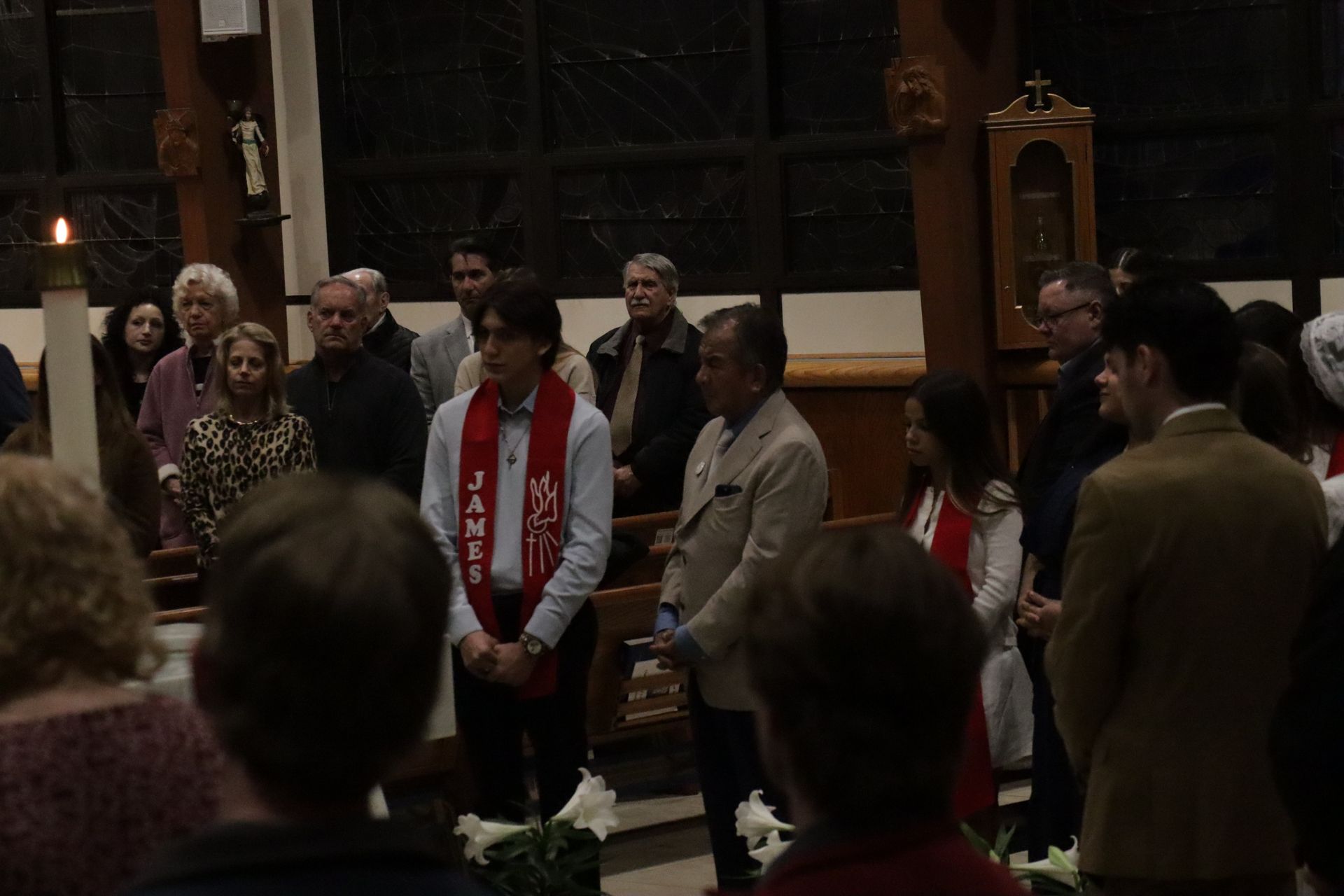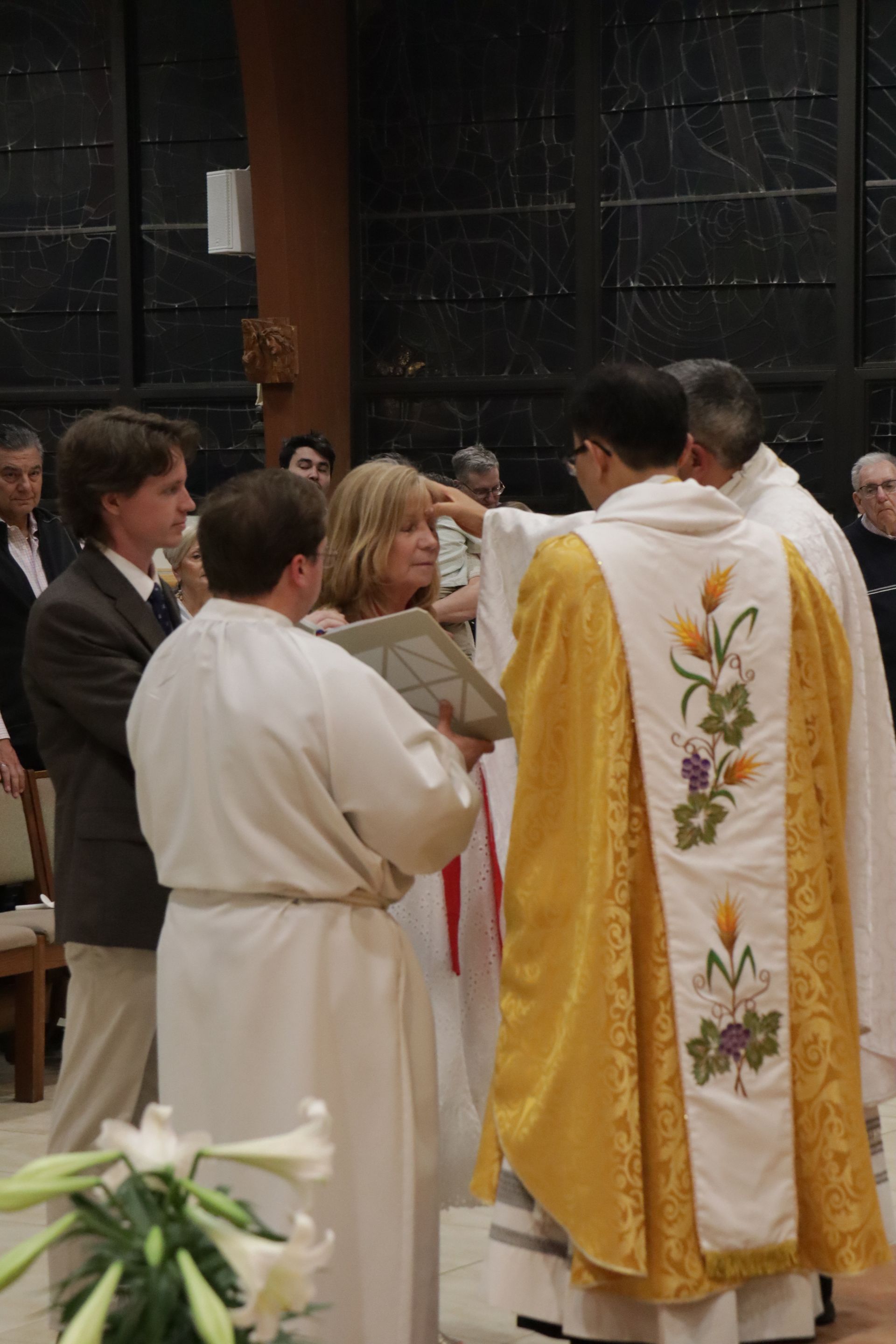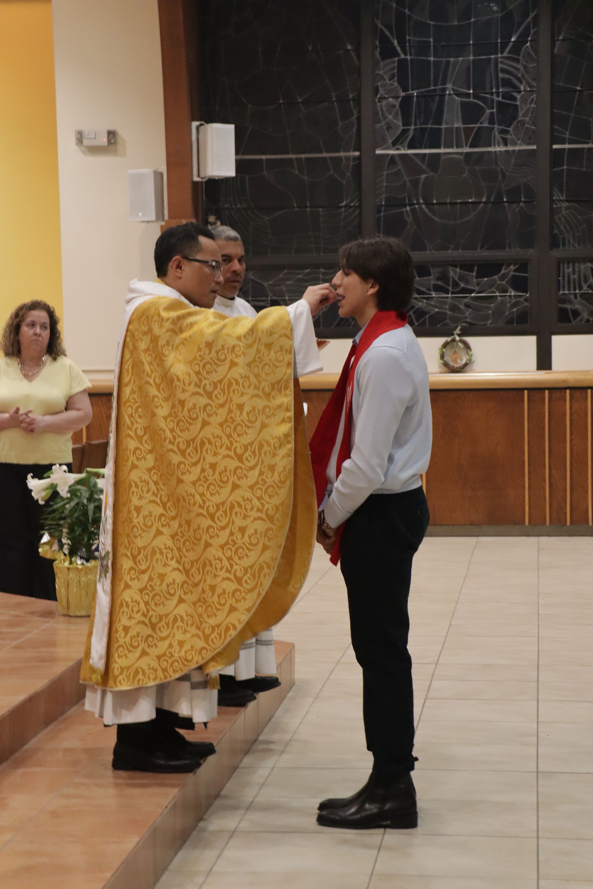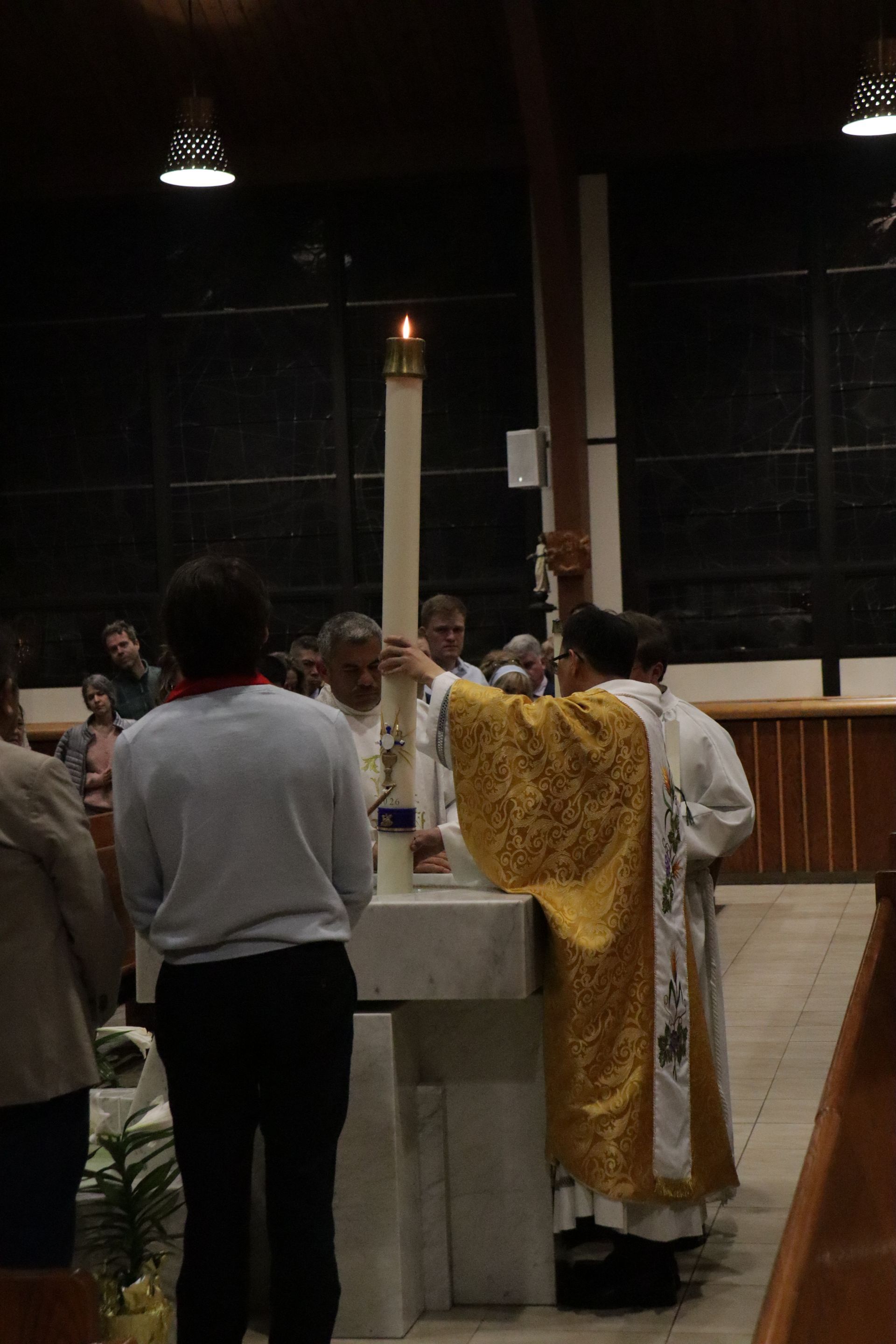 After the baptism the newly baptized are dressed in white garments and are presented with a candle lighted from the Paschal Candle. The newly baptized are then confirmed by the priest or bishop whose imposes hands on their heads, and invokes the gift of the Holy Spirit. He then anoints them with the oil called Sacred Chrism.