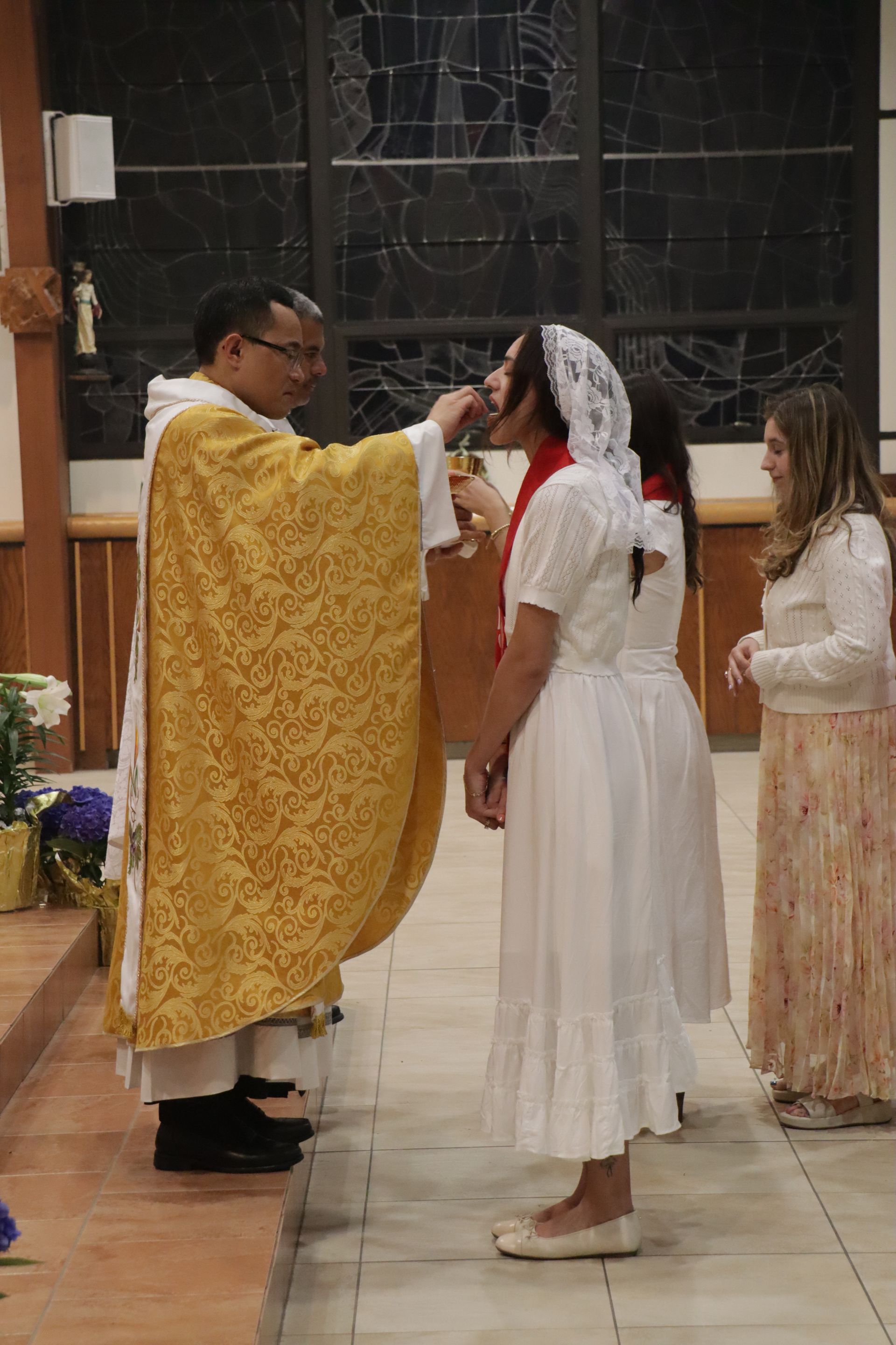 The Mass continues in the usual fashion. Now the newly baptized participate in the general intercessions, in bringing their gifts to the altar, and they share in the offering of Christ's sacrifice. At the Communion of the Mass, each of the newly baptized receives the Eucharist, Christ's body and blood, for the first time.